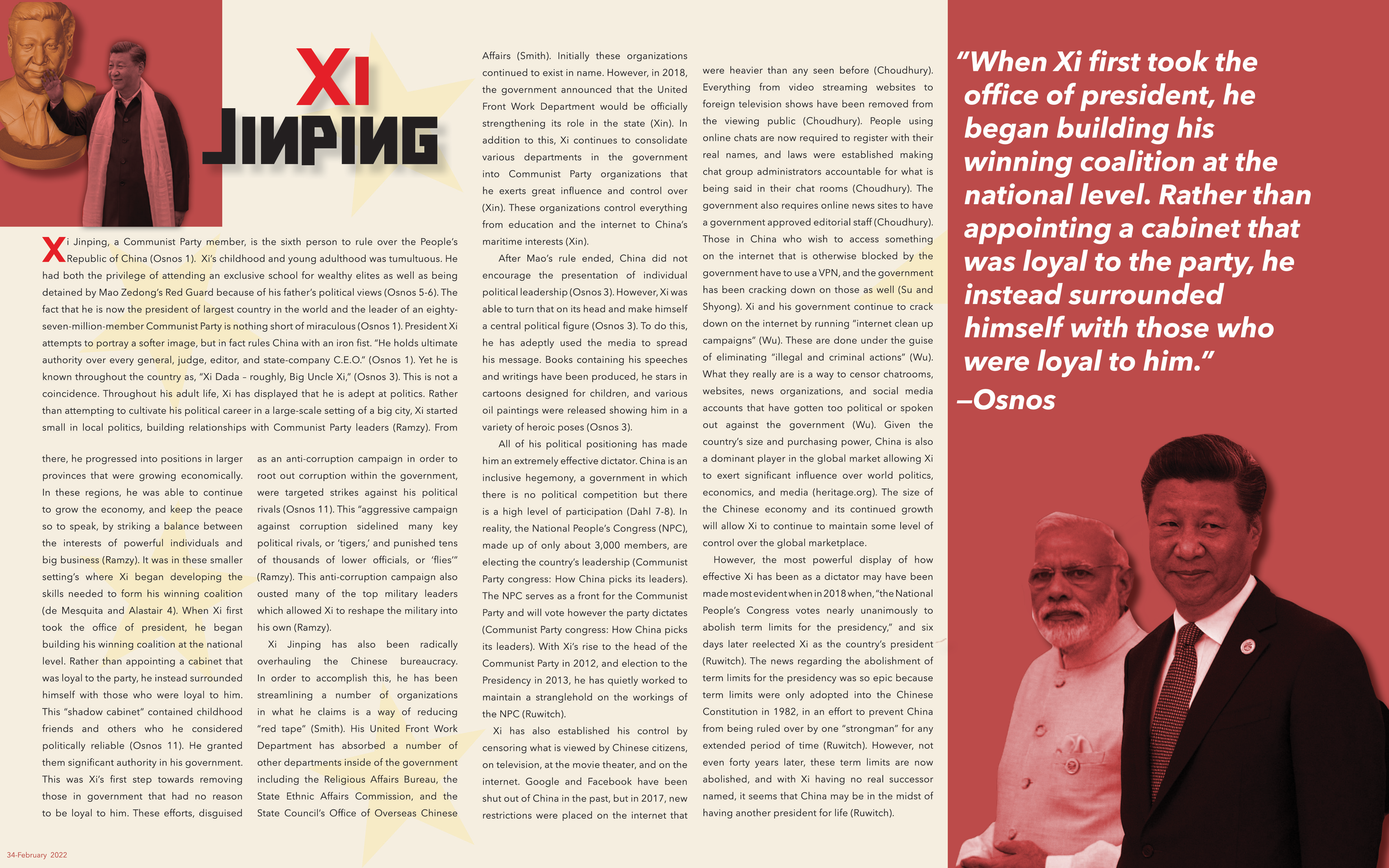 This magazine spread explores the history of Chinese President Xi Jinping and his rise to power. The project combines a mix of photographs and vector illustrations; brought together by using colors from the Chinese flag.