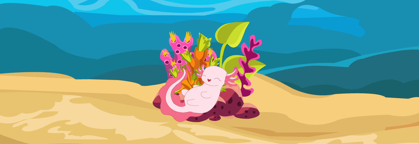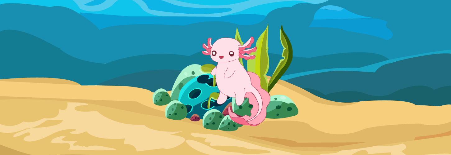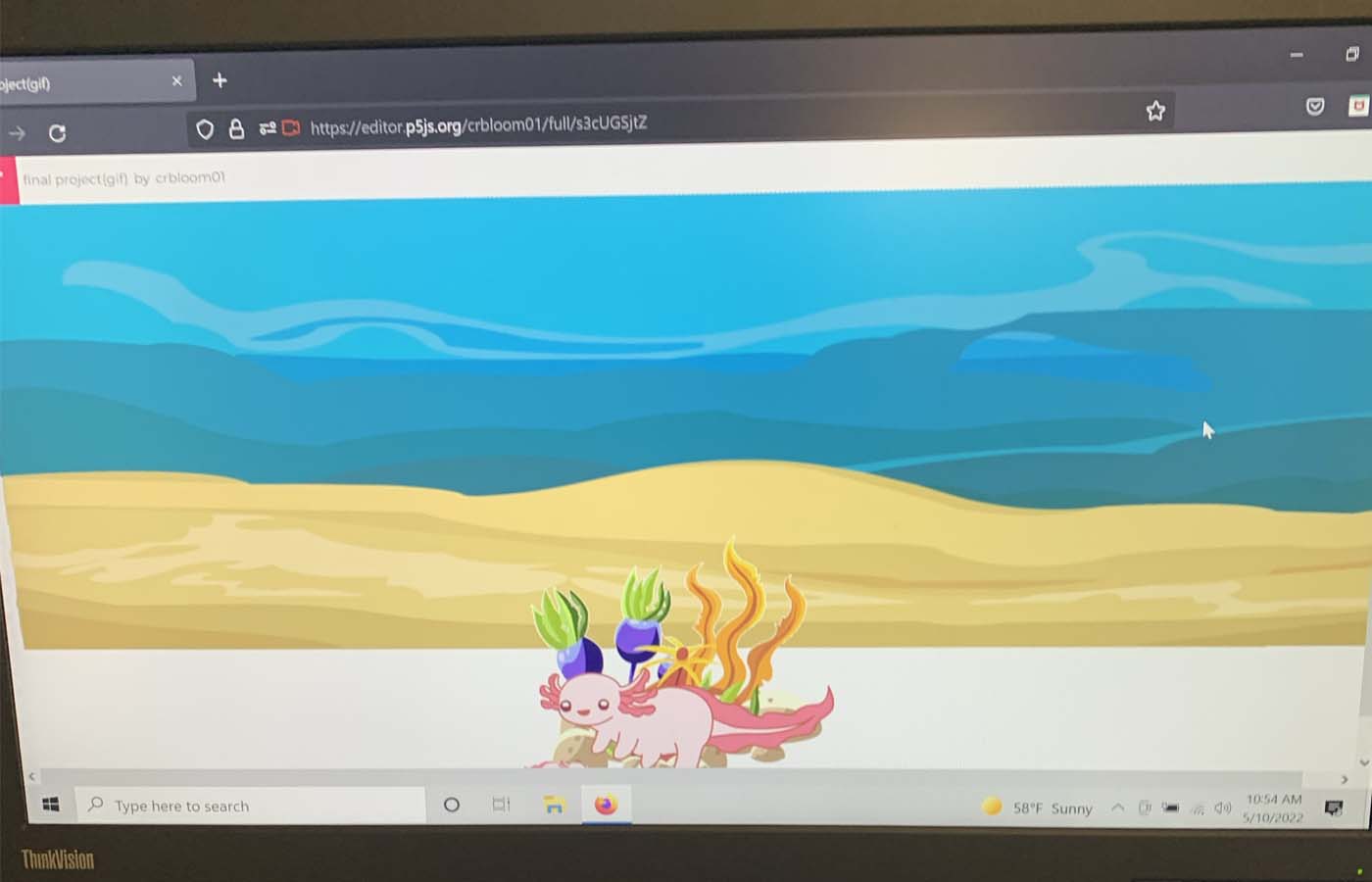The use of HandPose coded with P5 for motion tracking allows the user to interact with this project. The webcam captures the movement of the users wrist and hand and allows them to interact with Adobe Illustrator generated illustrations of an axolotl.