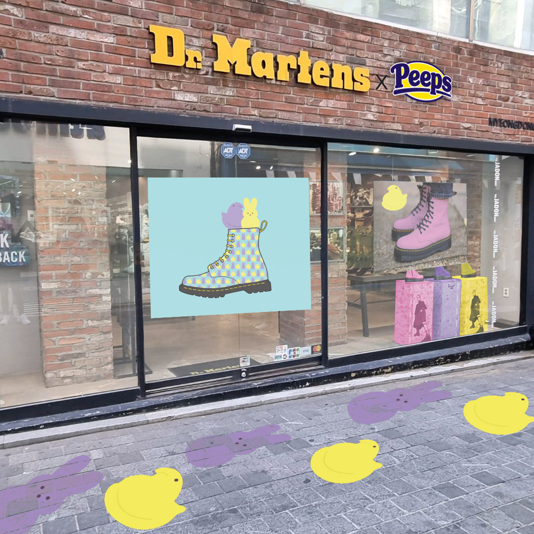 palette is a combination of the bright colors that Peeps are known for and the usual yellow and black of the Dr. Martens brand. A mix of photographs and vector illustrations were used to complete the overall style.